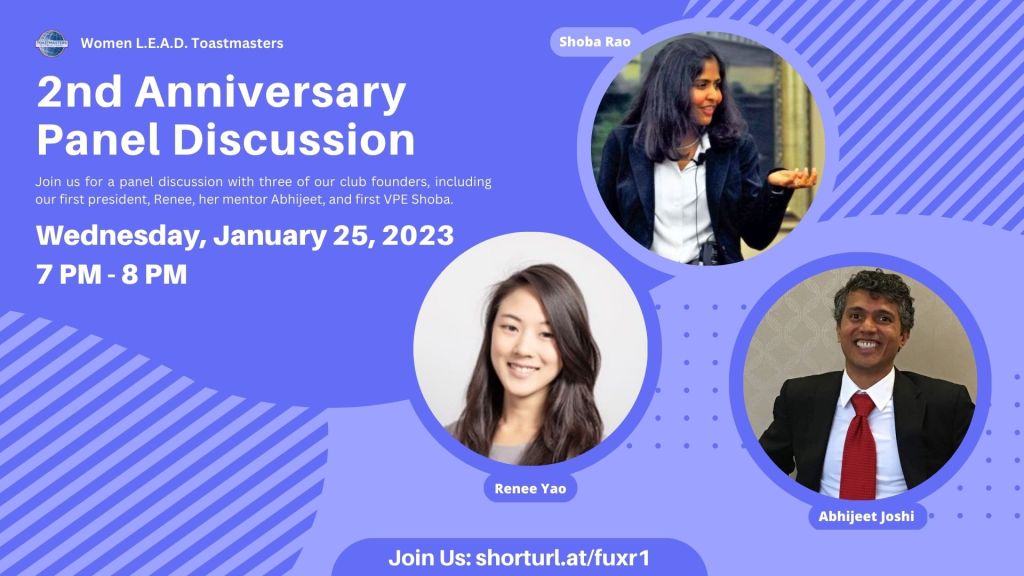 Women LEAD celebrated our second anniversary by hosting a panel discussion with the founders of the club, Renee Yao, Shoba Rao, and Abhijeet Joshi. SuJin moderated the panel with insightful and thoughtful questions and she provided a safe and nurturing environment for all of us to ask questions of the panelists. Our founders answered our questions on ways to improve the quality of our club programs, recruit and retain members, and improve the club’s diversity. They also described the meaning behind our club name (LEAD – L – leadership, E- empowerment, A – advocacy, D – diversity), which was inspirational and encouraged us to continue the excellent work they did founding the club.