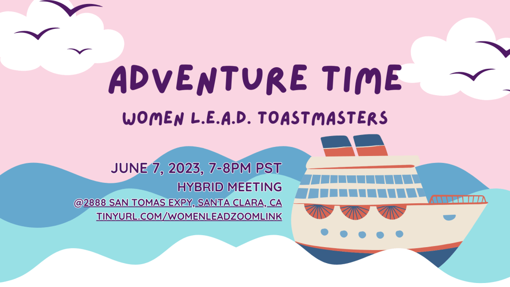 Our new club emprise: a New Member Induction led by our VPM, Ramya. We officially welcomed Ruhina, Jun, and Gail as club members. Abhijeet led a workshop, “How to Craft a Speech” and told us to start in Media Res, bare our souls, and dig deep! Table Topics Master Liz asked two of our guests to share their best and worst adventures, both wonderfully entertaining (and over a minute each, well done!). General Evaluator Patrice asked the audience for a short round-robin feedback session for Abhijeet. Let’s go on an adventure this summer!