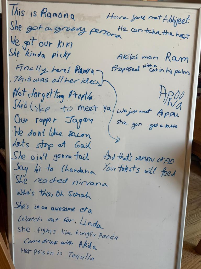 So much fun! Thanks to Akila and her husband Ram for hosting. See below for Women Lead’s original rap lyrics (video in WhatsApp). Honestly, if this tech career thing doesn’t work out for you guys…